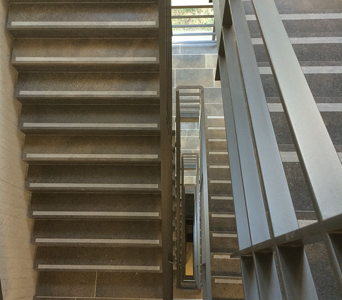 Dieses Projekt hatte es wortwörtlich in sich. Wir fertigten passgenaue Natursteinstufen in Stahlwange, mit eingearbeiteten sandgestrahlten Rutsch- und Sichtstreifen.